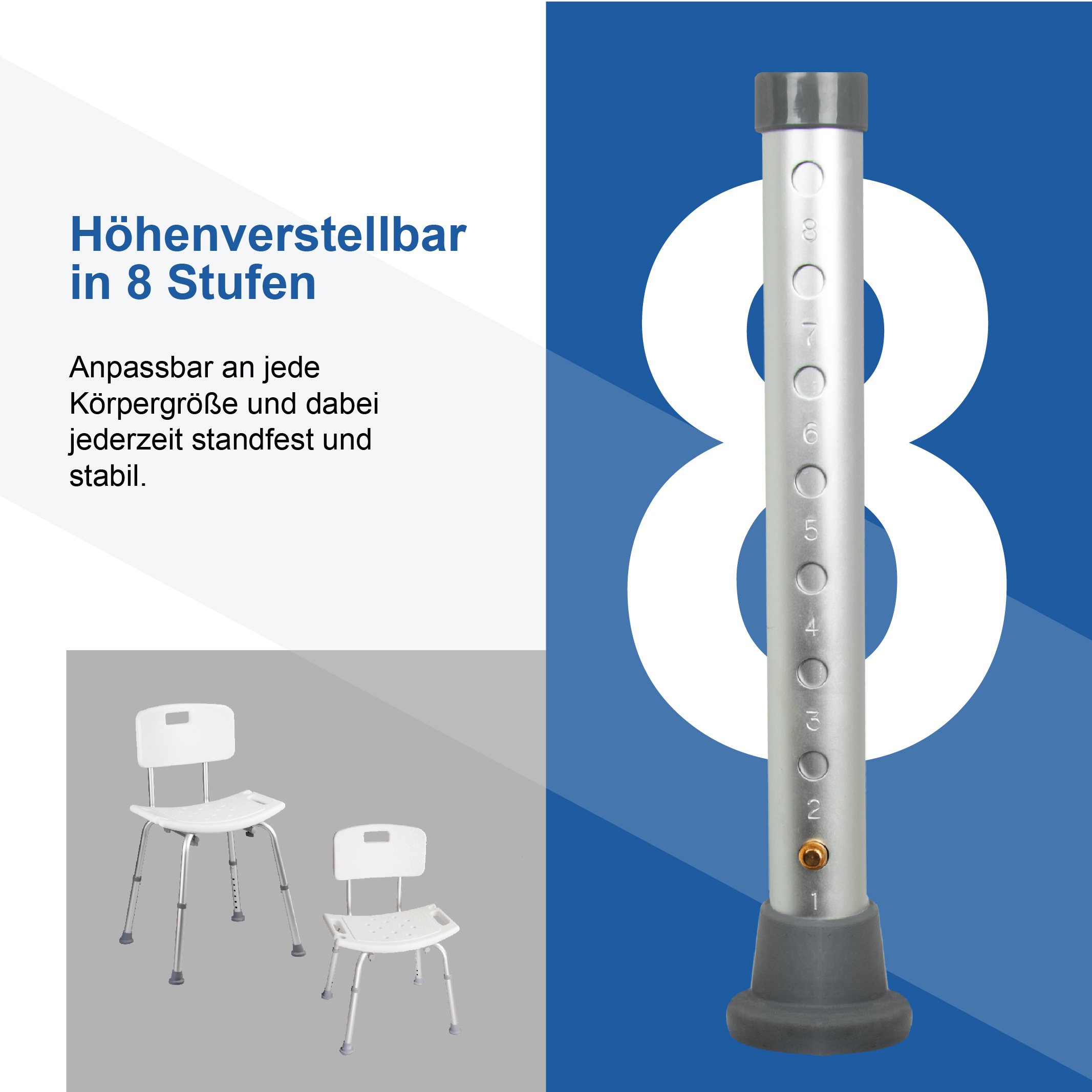Der Badezimmerstuhl ist höhenverstellbar von 38 - 56 cm, für beste Ergonomie bei jeder Körpergröße.