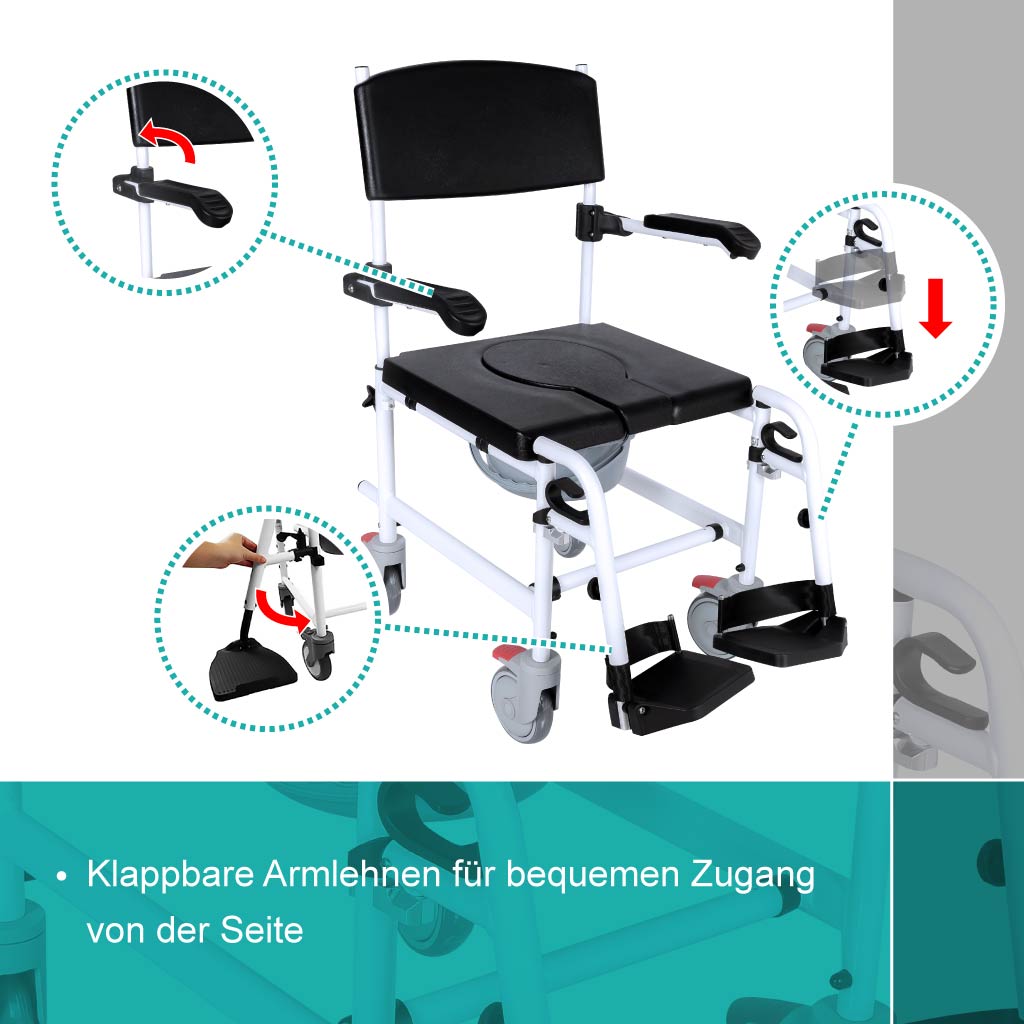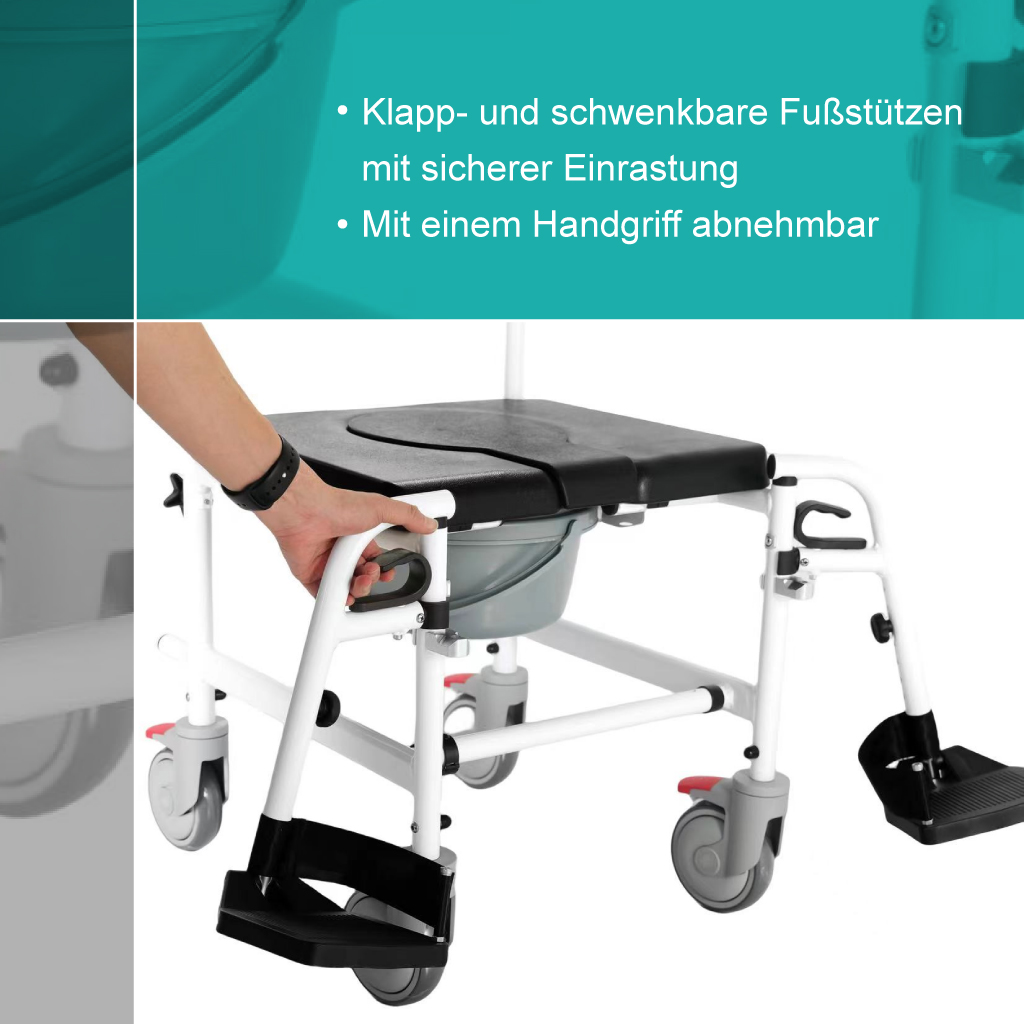 - ✅ MOBILITÄT UND SICHERHEIT: Dank der verstellbaren, schwenkbaren und einklappbaren Fußstützen sowie der leisen Universalrollen mit Bremsen ist der WC-Rollstuhl mobil und sicher in der Anwendung, perfekt für den Einsatz als fahrbarer Nachtstuhl.