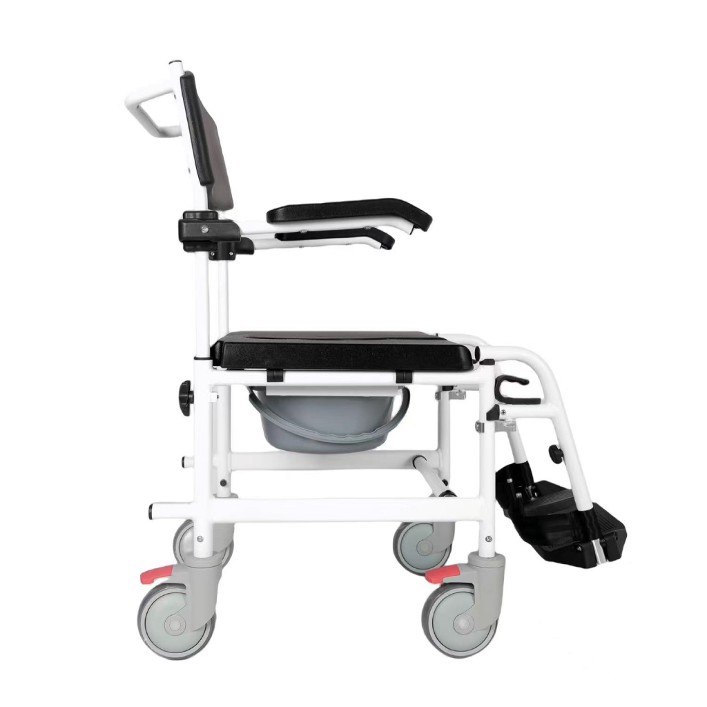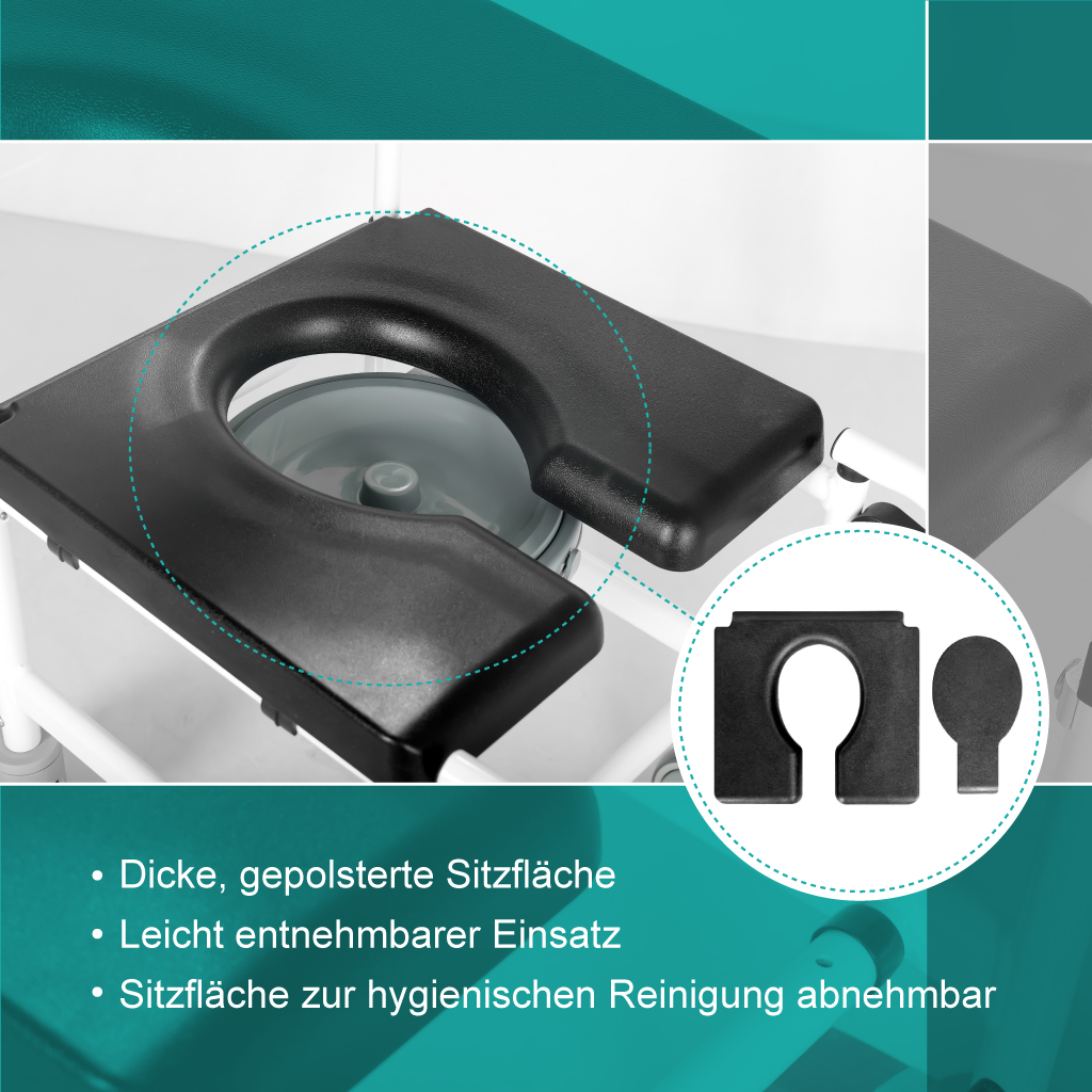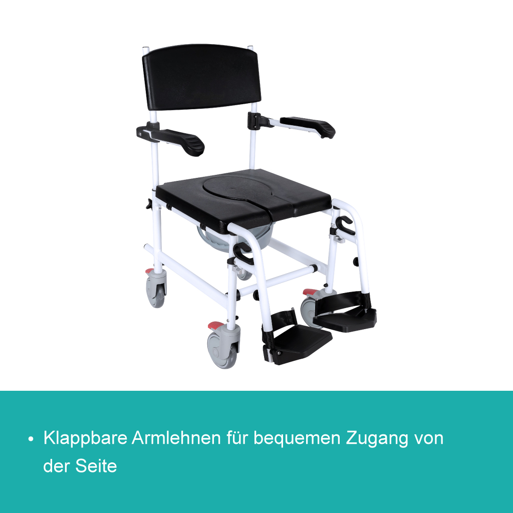 Er kann in der ganzen Wohnung eingesetzt werden. Dieser Rollstuhl verfügt über hochklappbare Armlehnen, Fußstützen, eine gepolsterte Sitzfläche und eine Rückenlehne für maximalen Komfort und Stabilität. Der robuste Rahmen aus Aluminium ist leicht und dennoch stabil, mit einer Tragfähigkeit von bis zu 120 kg. Die leichtlaufenden Lenkrollen mit Bremsfunktion sorgen für sichern Halt auf glatten Oberflächen und die Kipphilfen erleichtern das Überfahren von Hinternissen. Der gepolstete Hygieneeinsatz und der leicht entnehmbare Eimer mit Deckel ermöglichen eine einfache Reinigung. Mit einer Sitzhöhe von 50,5 cm und einer Sitzbreite von 46 cm ist dieser Duschstuhl universell einsetzbar.